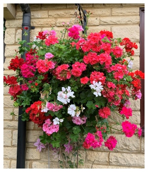 One of the geranium baskets that we supply to traders and residents in Tetbury